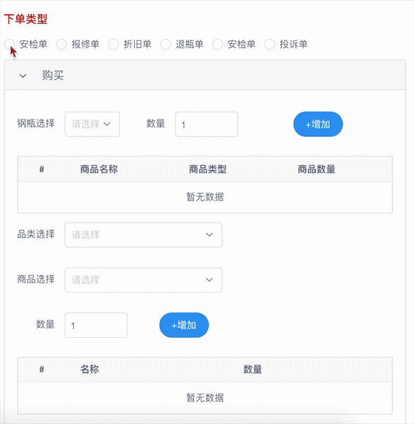 然后再从交互心理学上(我发明的!)吐槽一下:这个需求是不同的下单类型对应不同的表单内容,如果你使用了折叠面板作为不同的表单内容的容器,这很容易让人误会成无论我选择的下单类型是啥,折叠面板里的内容都是可以填的,不同面板里的内容如果我填了最后都会被提交出去!因为折叠面板本身只是对内容的收纳设计,可以节约空间,还可以让使用者随意切换自己想要看的那一级的内容,但从来没有内容如果被收起就不存在(不提交)了的意思!