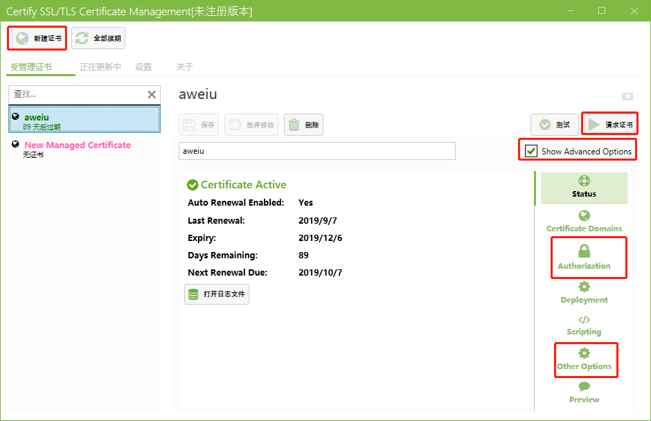 success提示,如果出错了请检查域名解析验证是否配置正确 - 勾选 Show Advanced Options,点击 Other Options 后可以看到证书路径(ProgramData 默认是个隐藏文件夹)